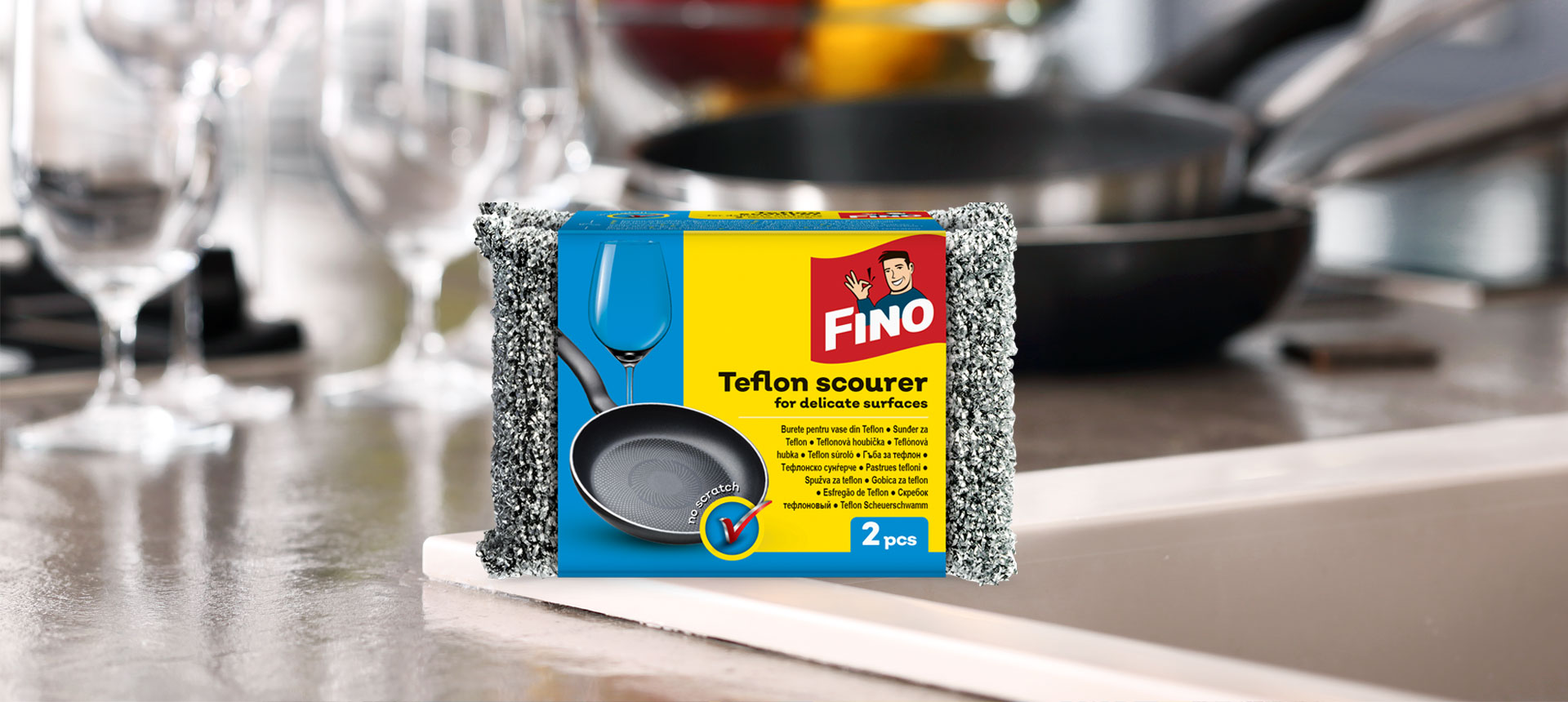 Fino teflonska spužva je idealna za svakodnevno pranje sveg neljepljivog posuđa (lonaca, tava). Zahvaljujući inovativnom sastavu, savršeno čisti osjetljive površine bez grebanja. Namijenjena je uporabi čak i na delikatnim kristalnim površinama. Čisti se lako i ne zadržava hranu i prljavštinu.