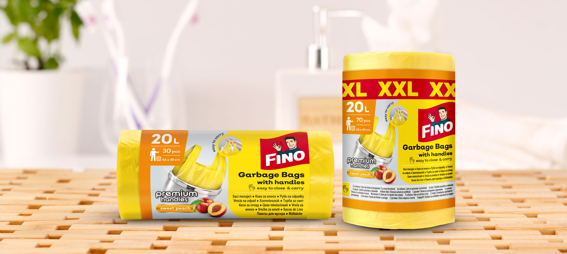 Odpadkové vrecká FINO PREMIUM HANDLES s praktickými ušami sú ideálnou voľbou na pohodlné a jednoduché prenášanie. Vďaka hviezdicovému zvaru na dne sú mimoriadne pevné. V žltej farbe s vôňou broskyne.